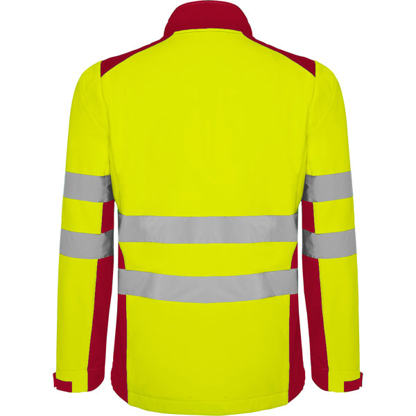 Softshell bicolore haute visibilité, résistant à l’eau, tissu intérieur doux avec une grande capacité de chaleur. Deux bandes réfléchissantes sur la poitrine et les manches. Col montant, fermeture centrale inversée. Poignets ajustables avec velcro. Ceinture avec gomme élastique et curseur pour ajustement. Trois poches extérieures.