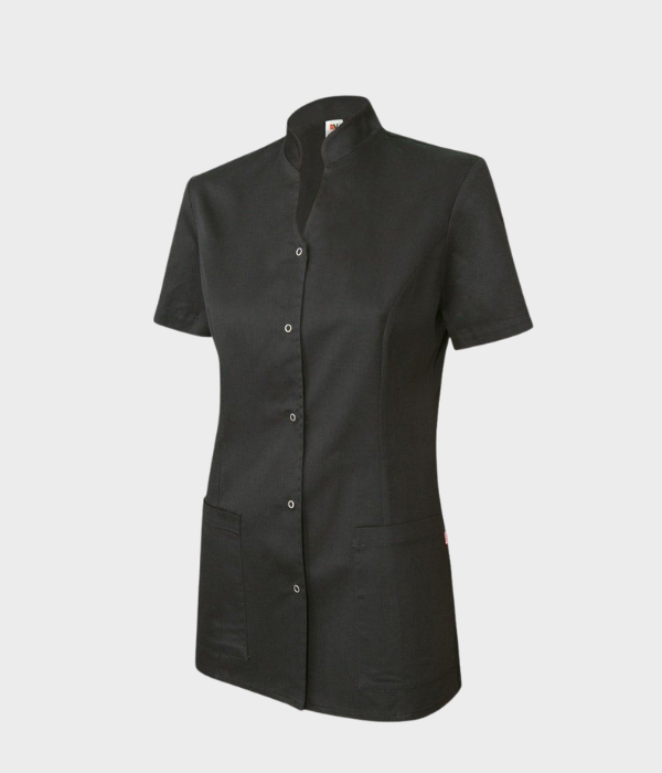 Blouseuse à fermeture centrale à boutons-pression, col mao élégant et manches courtes. Coupe partiellement cintrée. Deux poches inférieures de renfort pour une meilleure fonctionnalité.