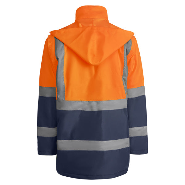 Parka haute visibilité combinée en deux couleurs, résistant à l'eau et au vent. Deux bandes réfléchissantes sur le corps et les manches. Capuche fluo et ajustable avec embouts. Poche en torse et poche transparente sur la poitrine droite pour identification. Deux poches frontales.